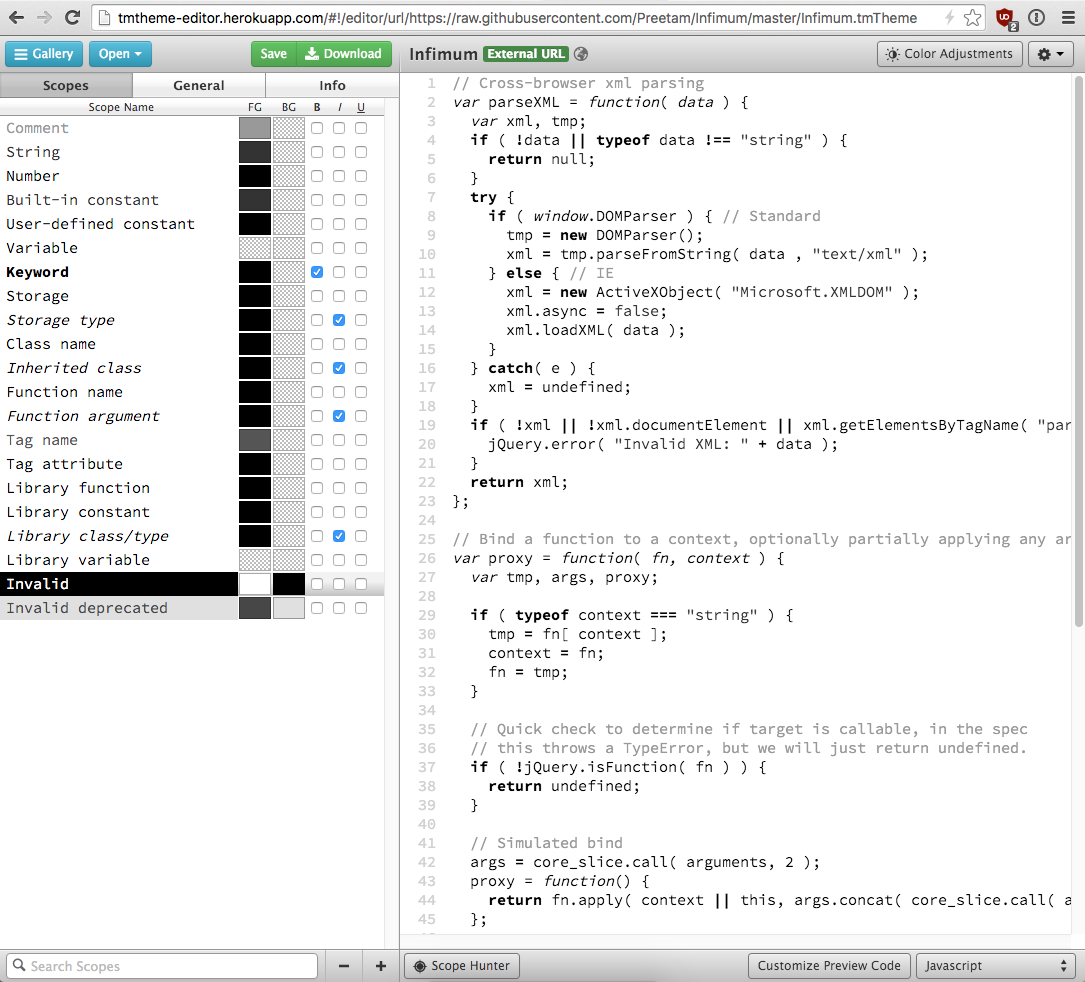 My Sublime theme Infimum is available on GitHub and I wrote a post about it before. Creating a theme is very simple. I used an online editor called TmTheme Editor. It’s not great but it has allowed me to make and view changes quickly. You can load a tmTheme file directly from a URL, so you can play around with Infimum from the GitHub repository. Many of the scopes are assigned the default style: black on white without any text decoration.