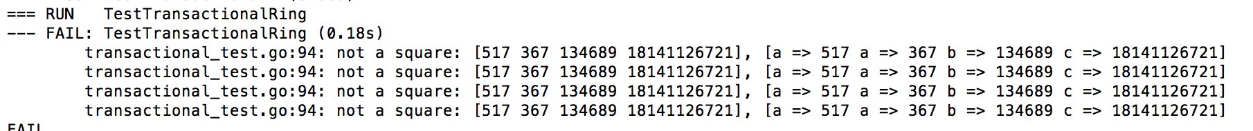 a, b, and c to be squares (writer goroutines)a, b, and c to verify the constraint (reader goroutines)Here are some weird consistency bugs I found. :)