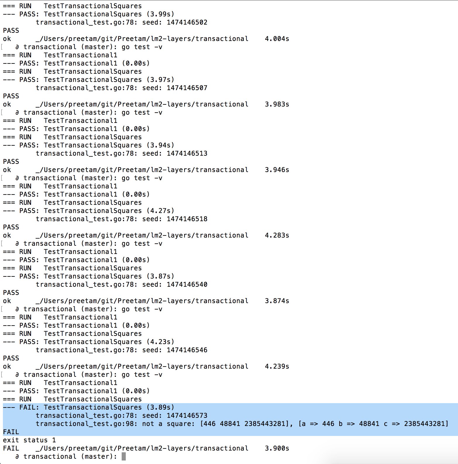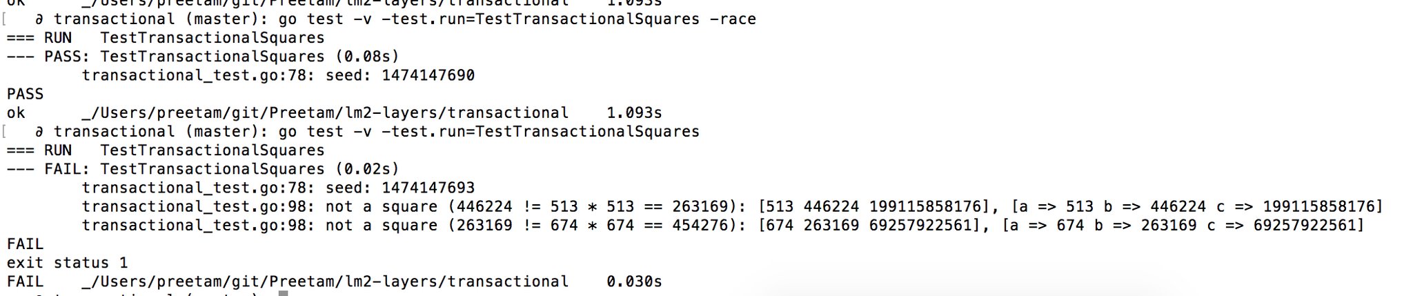 I created a [test] (https://github.com/Preetam/lm2-layers/blob/master/transactional/transactional_test.go) to verify some of these ACID properties, mainly consistency.