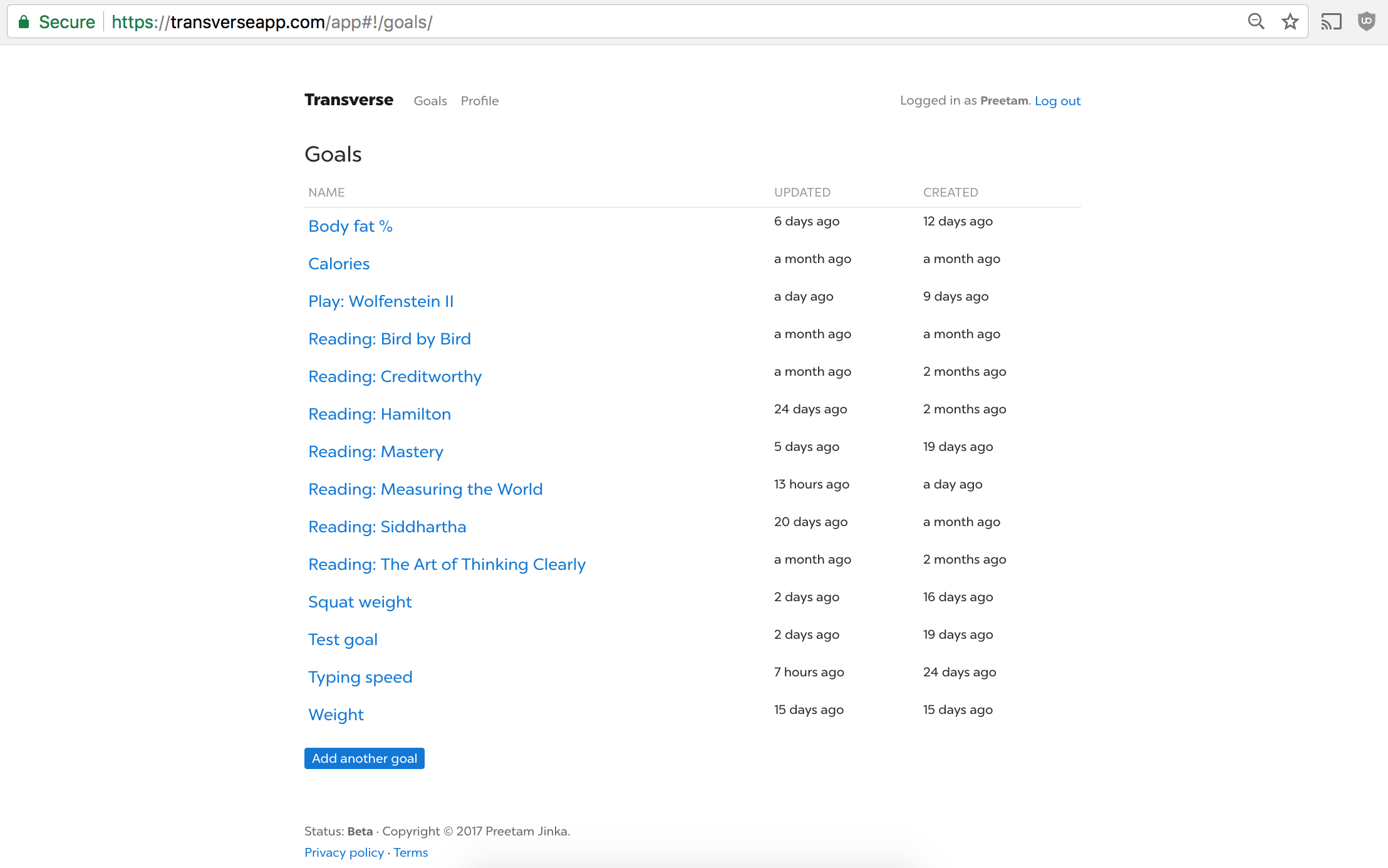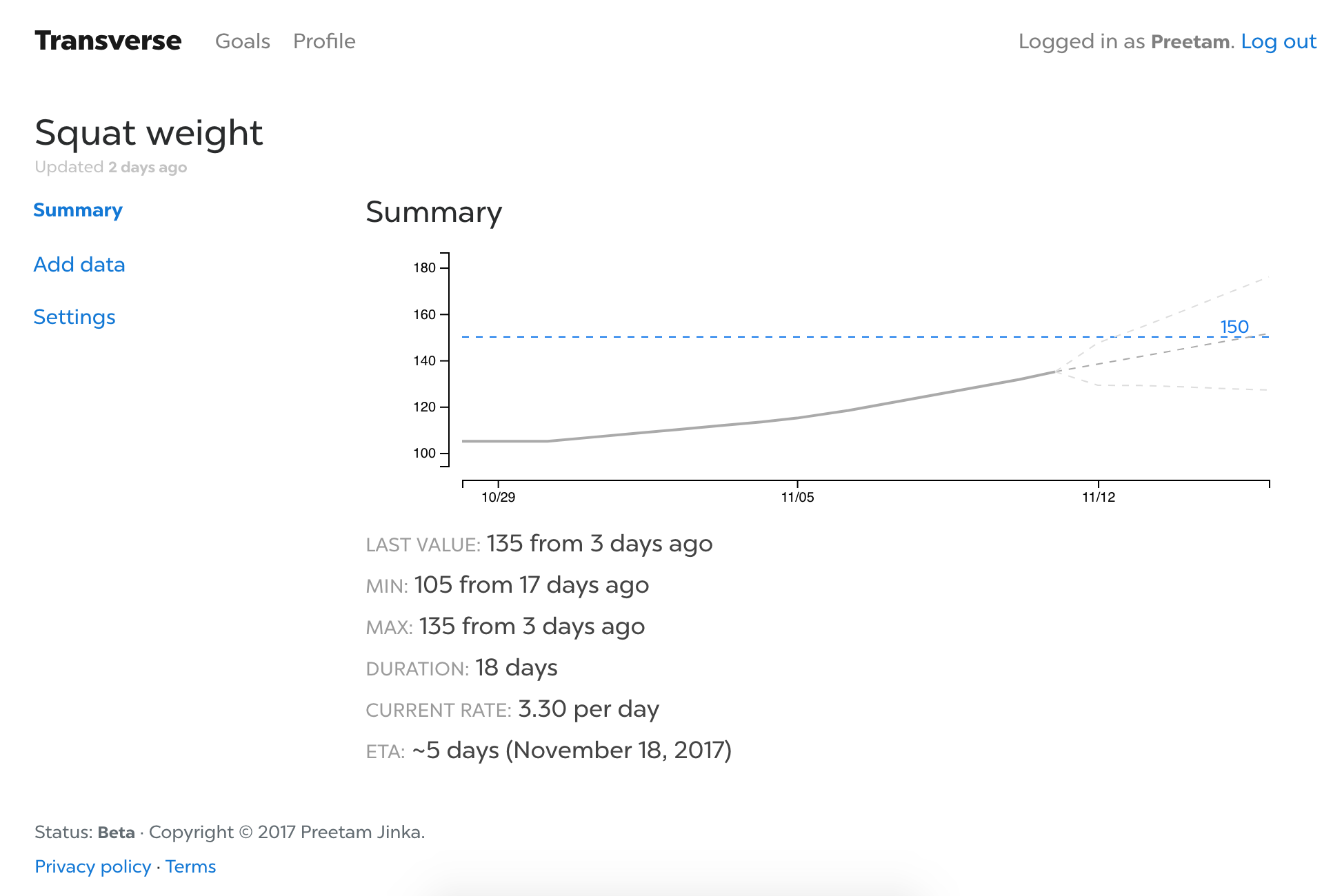 Two months ago I introduced Transverse, my app to forecast goal progress. Everything you saw on that page was just a mockup. Now, after actually building it and getting it in front of a few people, it’s ready for everyone! Note: this is an open beta. Stuff is messy. It’s kind of ugly. But it works.