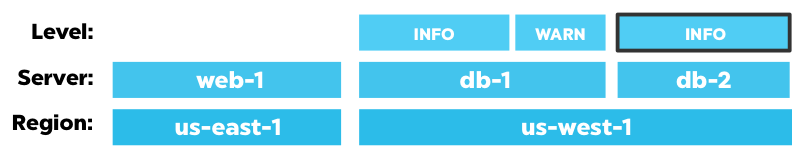 A Terrace file is made up of many layers. Each layer represents one attribute or dimension in your events. A level is a chunk of data, and multiple levels make up a layer. Levels also have nesting, so each level can have multiple sublevels which form the rest of the layers. In the following diagram, there are three layers: region, server, and level (like log level, not a Terrace level. Naming is hard!). Each blue box is a Terrace level.