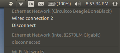 It shows up on my laptop as eth1. My laptop is assigned the address 192.168.7.1 and the board has 192.168.7.2. sshd is running on the board, so I can easily SSH in via 192.168.7.2:22.